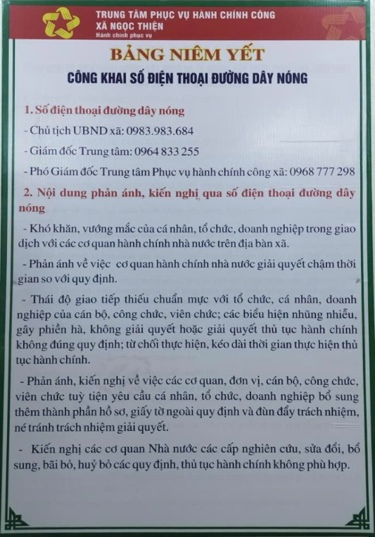 Công khai đường dây nóng xã Ngọc Thiện